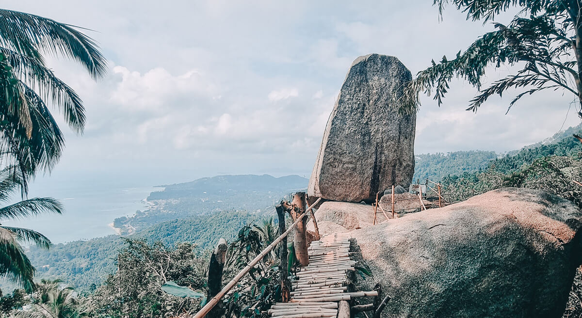 Владельцы кафе неподалеку предприимчиво обустроили тропу к данной смотровой, за вход просят 200 бат и дают напиток. Эта точка расположена чуть ниже, хотя вид тоже стоящий. Но в день нашего посещения, к камню подойти было нельзя из-за обрушения моста, поэтому мы однозначно решили пойти выше. По свежей информации, мост теперь прочный и можно смело туда идти. Точный адрес можно посмотреть здесь